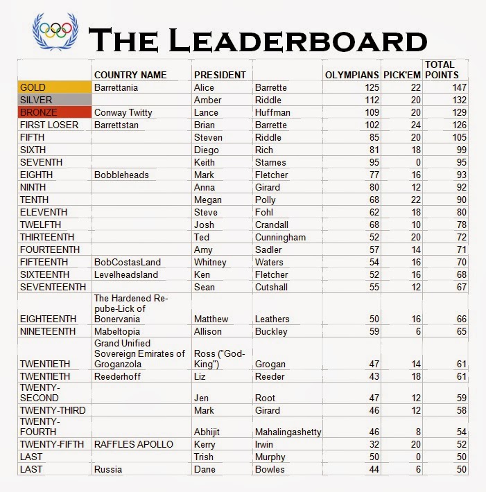 Remember the early days when Mabeltopia was on top? Then there was the rise and fall of Barrettstan before President B. Barrette eventually got beat by his own sister. President Cunningham finished a shocking thirteenth after his time at the bottom (heh). Season-long fence-sitters Presidents Fohl, Cutshall, and Crandall, finished in about the same positions they held all month, so I guess that\’s not much of a surprise. President M. Fletcher kept warning us not to count him out, and he finished a respectable 8th place, just behind President Keith Starnes in seventh, a shocking coup for a guy who didn\’t even bother to submit his Part Two picks. President Irwin just edged out a three-way tie for last by correctly selecting Russia to win the overall medal count, and God-King Grogan was unsurprisingly a disappointment in twentieth. My own father came in twenty-third, but will never know because the leaderboard print is too small for him to read without his glasses. President Root ice danced her way to very brief glory, while President K. Fletcher just didn\’t have the right spreadsheets to dominate this time.